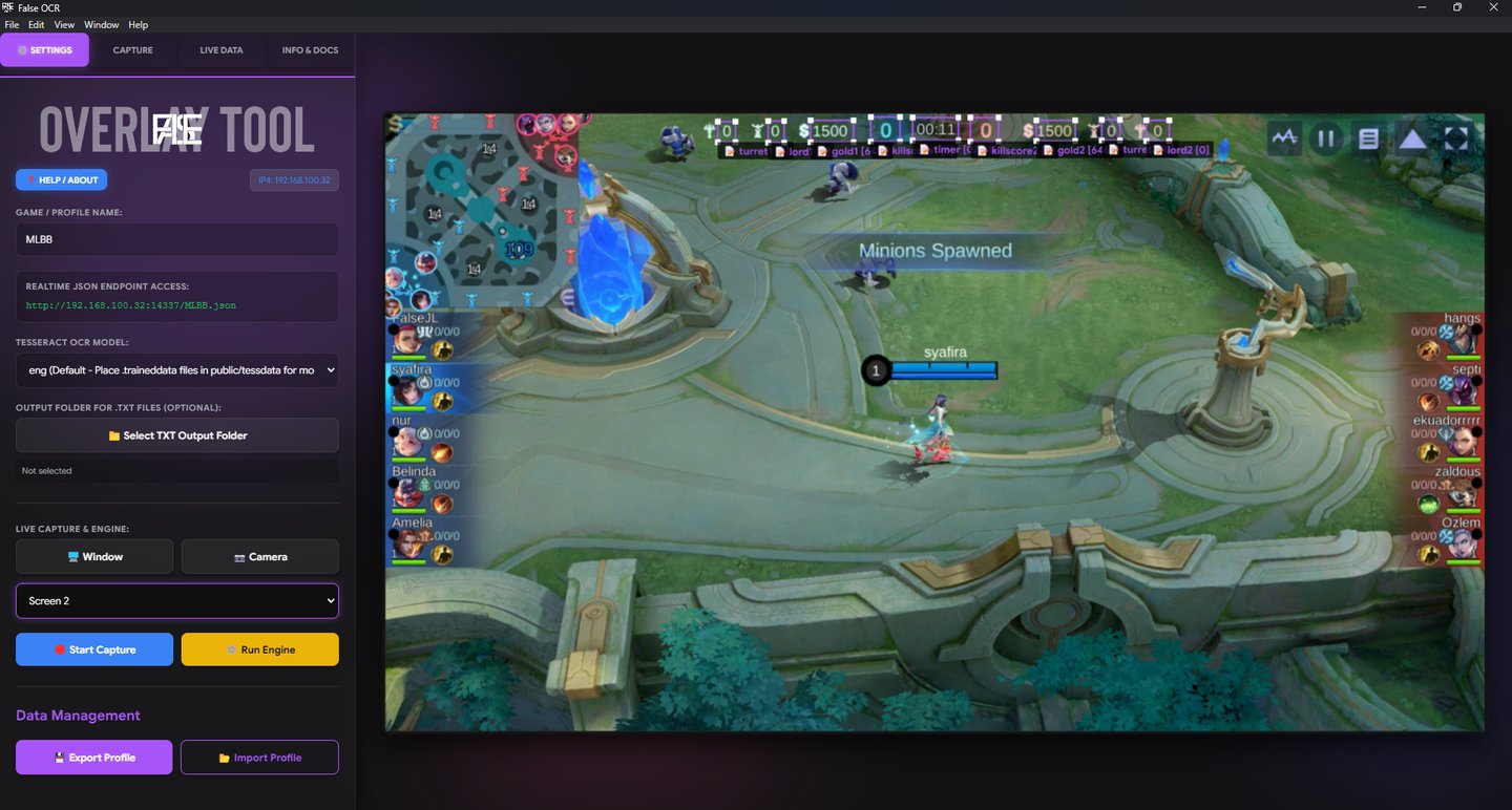 FalseOCR is an open-source, lightweight Optical Character Recognition (OCR) capture utility designed explicitly to empower live esports production, tournaments, and broadcast overlays. Built on Electron and Node.js, this tool captures live video feeds from specific windows, screens, or cameras, and uses the Tesseract.js engine to extract text and bar values in real-time. By mapping specific regions of a game feed, broadcasters can automatically convert on-screen visual data (like player scores, gold, or health bars) into dynamic, accessible data. The extracted information is instantly served to a local network via an Express JSON endpoint or saved directly as individual .txt files, making it seamlessly compatible with professional broadcast software like OBS Studio, vMix, and custom real-time HTML/CG overlays.